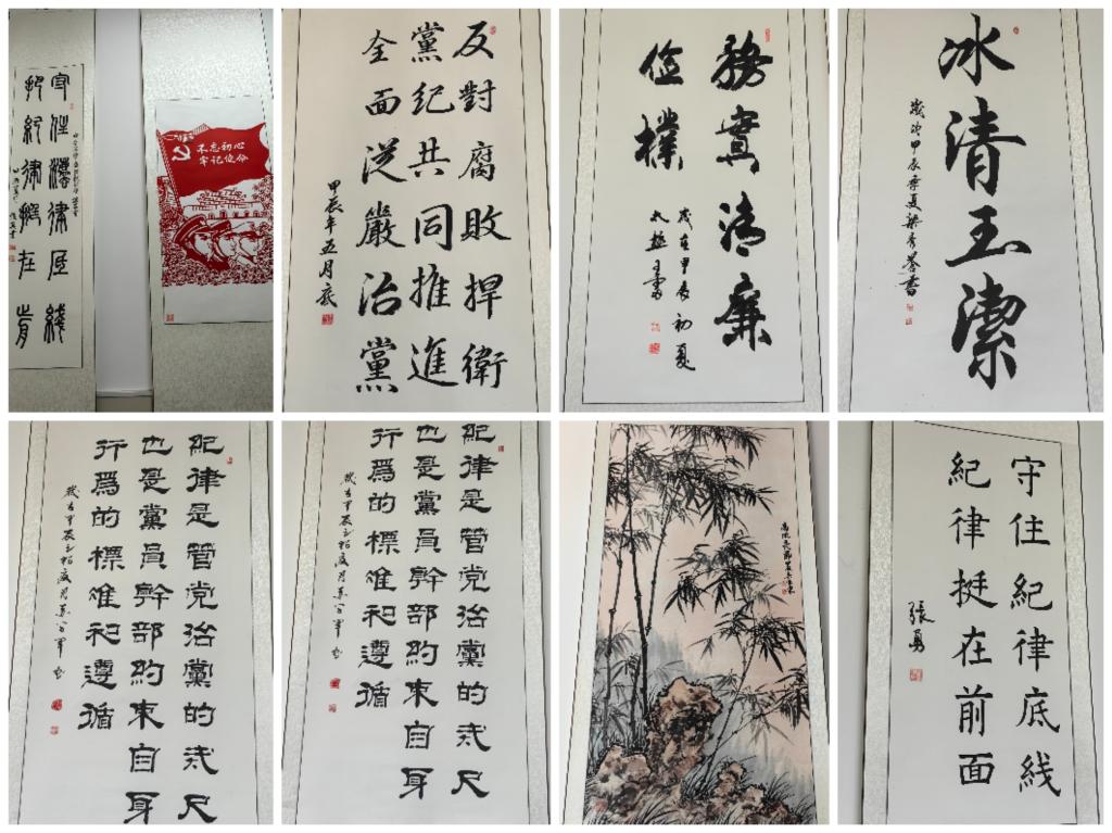 此次活动得到了校关工委的大力支持和广大离退休老同志积极参与。共收到书法、绘画、剪纸等作品46件;经筛选,共展出29件。参展作品紧扣学纪、知纪、明纪、守纪主题,既有书写党纪的格言警句,也有描绘象征廉洁的竹子,还有寓意美好的锦鸡、牡丹,作品体现了思想性和艺术性的高度融合,传递了党的声音,传递了正能量,让党员、群众在感受艺术、陶冶情操中,修身养性、砥砺品格,进一步坚定了理想信念,更加知敬畏、守底线。