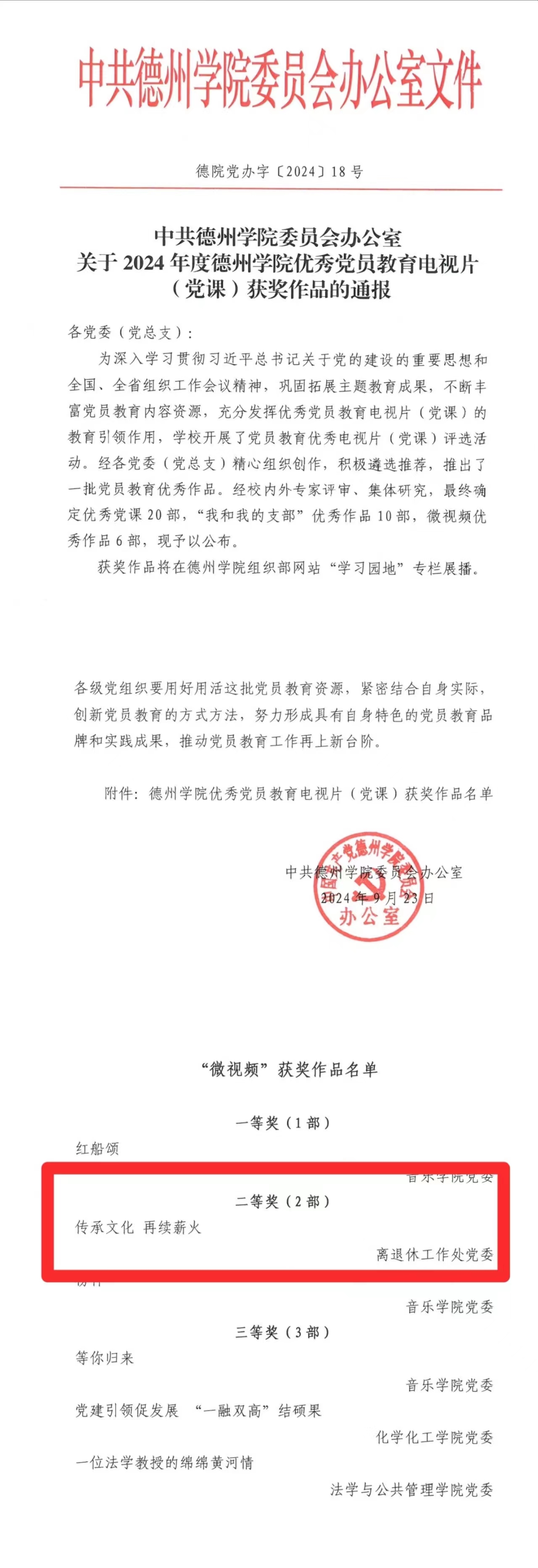 9月23日,久久综合网~永久入口作品《传承文化 再续薪火》在2024年度德州学院优秀党员教育电视片(党课)评选活动中获“微视频”二等奖。此次活动共推出优秀党课20部,“我和我的支部”优秀作品10部,微视频优秀作品6部。