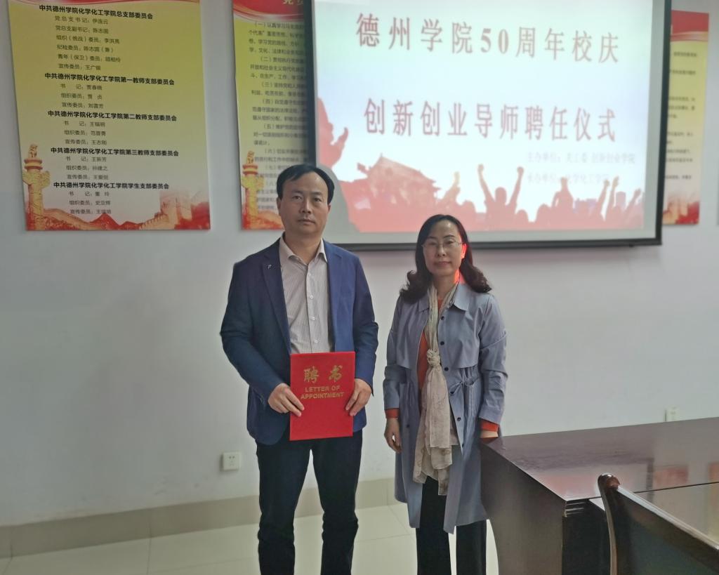 化学化工学院党总支书记为校友刘保良颁发了德州学院创新创业导师聘书。
