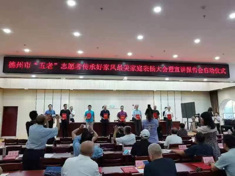 表扬大会暨宣讲报告会启动仪式由德州市关工委、市委宣传部、市委老干部局、市教育和体育局、市妇联共同主办。会议指出,近年来全市各级关工委和广大“五老”志愿者按照中国关工委、省关工委部署要求,深入贯彻落实习近平总书记关于家庭文明建设一系列指示精神,广泛开展了“传承良好家教家风,带头创建文明家庭”活动,弘扬红色基因和优秀传统文化的家庭教育蓬勃展开,文明家庭建设取得了丰硕成果,典型经验层出不穷。会议强调,要统一思想,从政治和全局的高度,深刻认识到传承好家风、弘扬红色基因和优秀文化,是各级关工委和广大“五老”志愿者义不容辞的社会责任;要主动作为,在开展传承好家风主题活动过程中,充分发挥“五老”志愿者的优势作用,广泛吸纳一批刚退出现职工作岗位、具有家庭教育专业特长的老同志参与进来;要创新形式,组建“五老”宣讲团、报告团进机关、学校、社区、农村广泛开展宣讲活动,组织引导“五老”以书画展、家长节、主题征文、整理治家格言、与留守儿童结对、微视频等形式带头亮家风、定家规、晒家训;要密切配合,注重与宣传、老干部、教育、妇联等部门建立健全沟通协作的联动机制,加大与宣传部门和新闻媒体的沟通交流,形成工作合力。