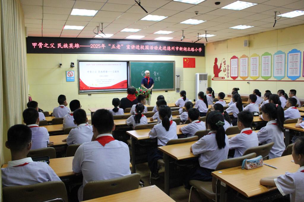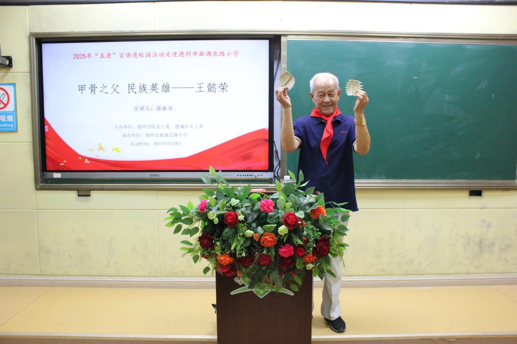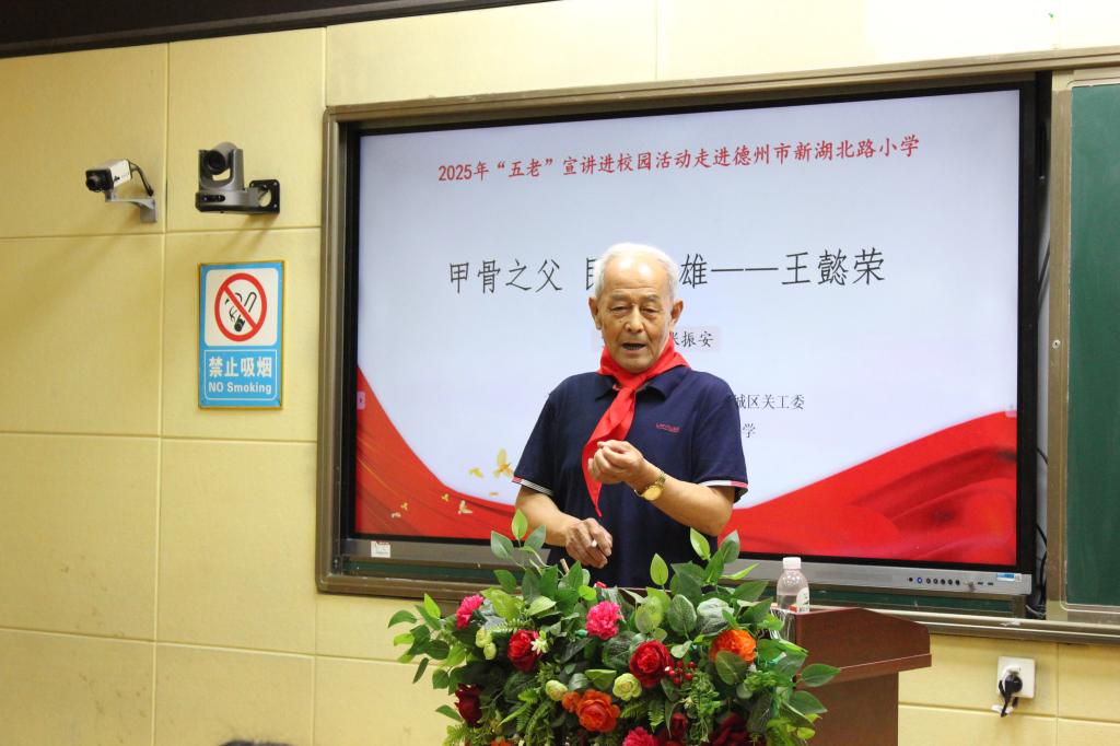 6月9日下午,校关工委“五老”宣讲团走进德州市新湖北路小学开展党史与爱国主义教育宣讲活动。年近八旬的老教授张振安以《甲骨之父 民族脊梁——王懿荣的精神丰碑》为题,通过一堂有温度、有深度的思政课,为师生们展开了一幅家国情怀与文化担当交织的历史长卷。