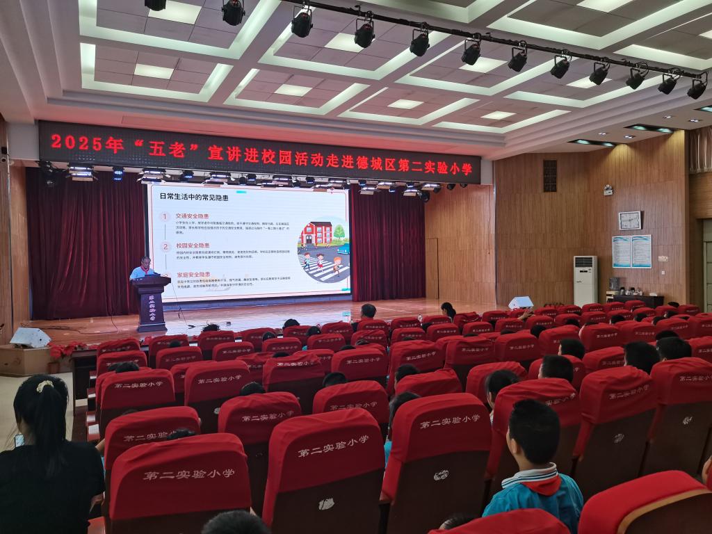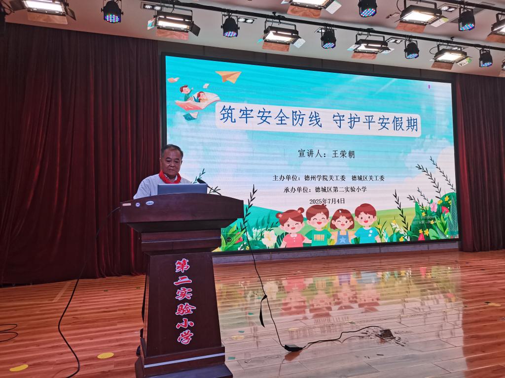 7月4日下午,校关工委“五老”宣讲团走进德城区第二实验小学开展暑期安全教育宣讲活动。老干部王荣朝以“筑牢安全防线 守护平安假期”为题,通过视频展示、案例分析和互动讲解等形式,为学生们上了一堂生动实用的安全课。